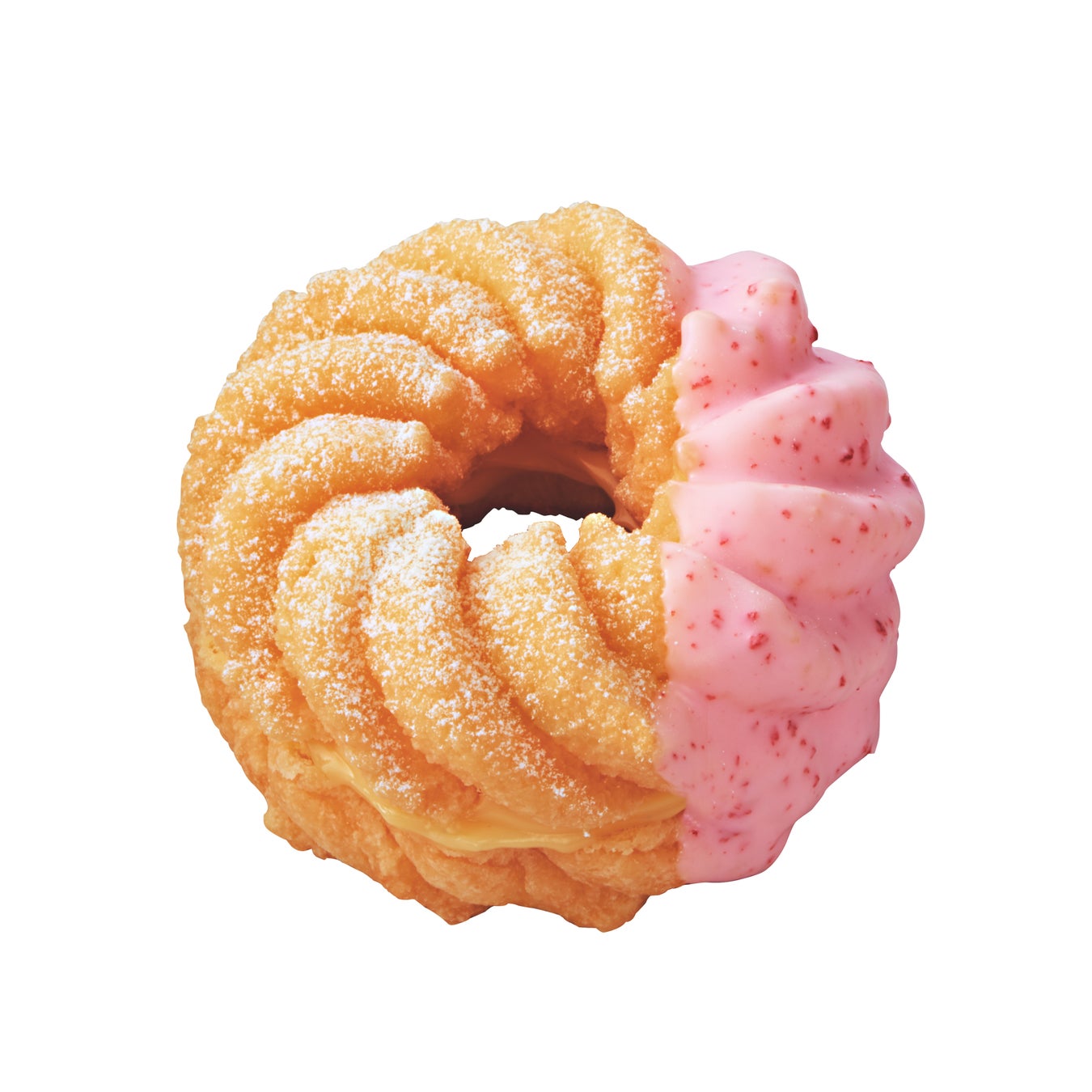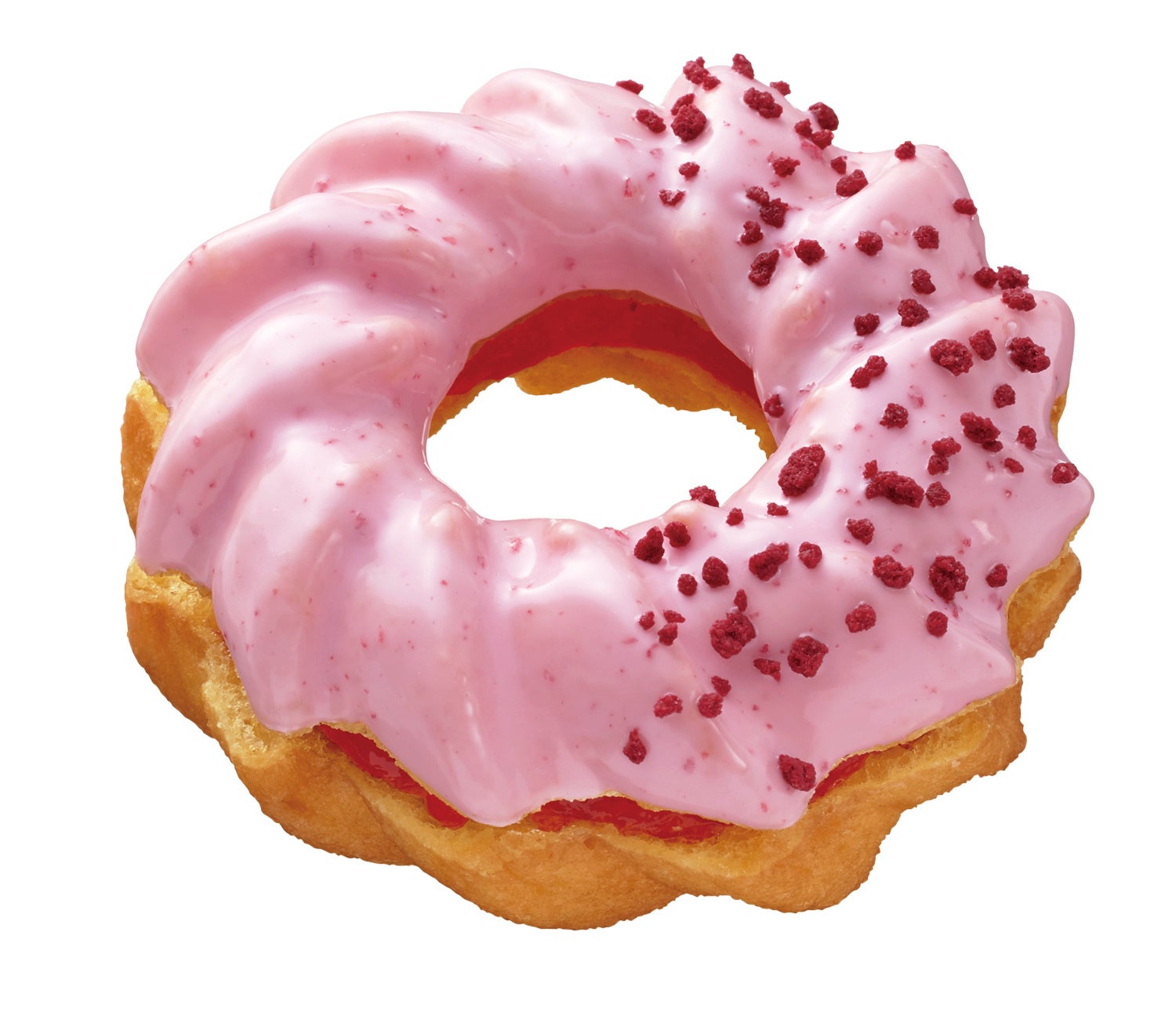 生フレンチクルーラー生地にホイップクリームとすっきりした酸味が魅力の2種のミックスベリージャムをサンド。ストロベリーチョコをコーティングして、フランボワーズシュガーをトッピングしました。