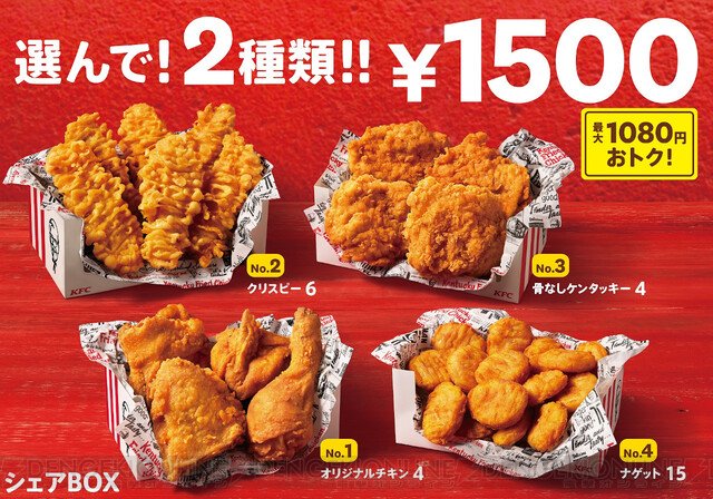 みんな大好き“①オリジナルチキン4ピース”、にんにくと醤油の味がたまらない骨なしの“②カーネルクリスピー6ピース”、オリジナルチキンのおいしさを骨なしで楽しめる“③骨なしケンタッキー4ピース”、カーネル秘伝の11ハーブ&スパイスで味付けした“④ナゲット15ピース”から選べます。