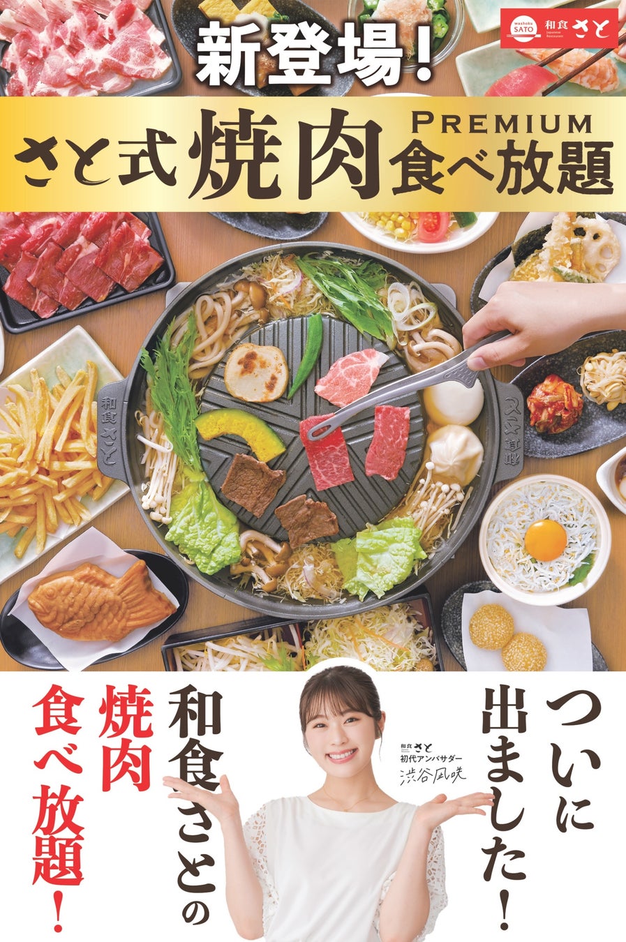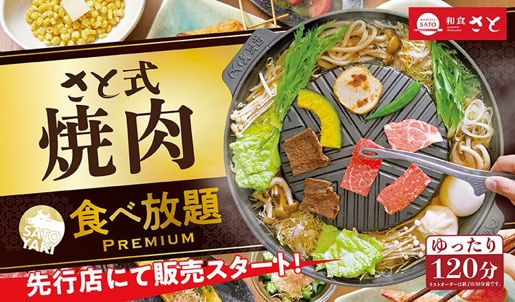 人気のしゃぶしゃぶ食べ放題「さとしゃぶ」、そして、すき焼き食べ放題「さとすき」に続く新しい食べ放題メニューとして、一部店舗で「さと式焼肉」を先行販売してきましたが、8月4日(木)から関西全店とその他一部店舗で販売店舗を拡大し、さらに8月18日(木)から中部地区全店(予定)、そして9月1日(木)から関東地区全店(予定)で販売を開始し和食さと全店での販売を予定!